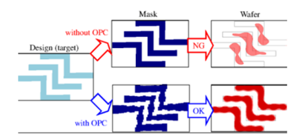 -OPC(Optical Proximity Correction): 광 보정법, 왜곡(Shrink, Rounding 등) 예상지점의 Mask를 미리 변조해 사용. (Calibration, 교정)