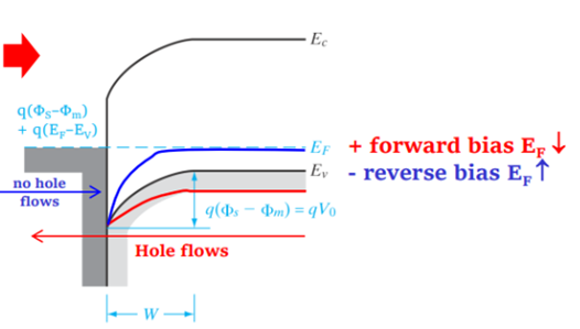 이는 Bias가 낮을 땐 정공이 흐르지 못하지만 일정 수준 이상이 된다면 전자가 장벽을 넘어가면서 전류가 흐름. (Schottky)
