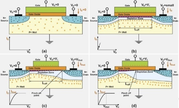 (d)Pinch Off: Saturation이후 D 전압이 더욱 커지면서 Depletion영역이 증가하여 Channel이 끊어지는 현상.