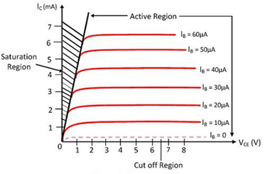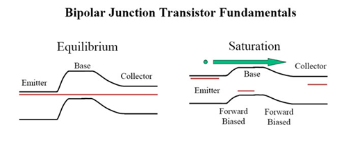 3) Saturation(포화): EB-순방향, CB-순방향, Switch On(Closed Switch), Ib가 증가해도 Ic큰 변화 없음(모두 Base로 모이기 때문)