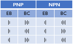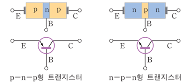 E와 C가 같은 반도체, B는 다른 반도체, PNP와 NPN이 있음