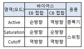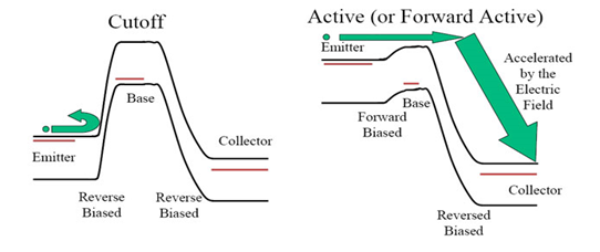 1) Cut Off: EB-역방향, CB-역방향, Switch Off, 누설 전류 가능성 있음. Carrier가 모두 Base 로 들어옴(PNP), 전류 방향이 모두 Base(NPN)