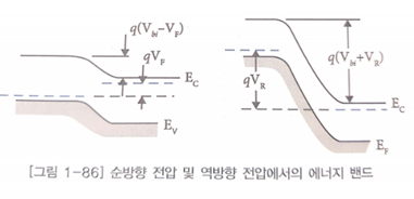 Energy Band=전자의 전기적 위치 에너지(W)=-qV (전자의 전하량은 음수).따라서 양전압이 가해진 쪽이 에너지 레벨이 내려감.