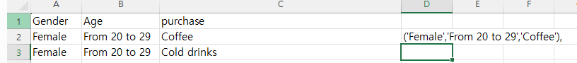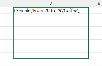 - 이후 insert문 사용을 위해 괄호, 작은따옴표, 콤마 추가 (값을 이동할 때 ctrl + 방향키를 사용하면 단어 단위로 이동함)