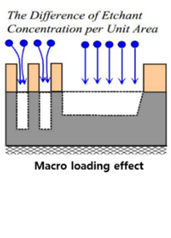 2) Macro Loading Effect: 면적이 넓어서(또는 Wafer가 너무 많아서) Etchant Gas가 부족해 Etch Rate가 낮아지는 것. 넒은 면적을 Etching시 Gas가 불균일하게 주입되어 깊이가 균일하지 않을 수 있음.