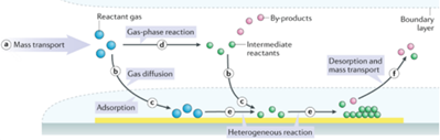 Chemical Vapor Deposition (CVD): 화학기상증착법, 가스의 화학반응을 이용. 주로 기체형태. 모든 형태의 증착에서 사용되는 방법. 장점 상대적 저렴, 품질 우수, 도포성 우수, Step coverage 좋음, 접착력 우수 단점 Chamber진공 이용. 고진공일수록 Mobility 감소, 오염위험 큼, 두께 조절 어려움, Byproduct 독성 중화 비용 소모. 고온 공정 진행 과정 기체(반응가스, 전구체)가 Chamber 내부로 주입되면 대류와 확산을 통해 Target 표면으로 이동한 후 흡착. 이후 흡착된 기체는 표면확산이 일어나 전체로 이동. 이후 기체와 표면사이에서 화학 반응 발생. 반응되어 나온 부산물은 기체 형태로 확산되어 빠져나감.++Surface Reaction Rat..